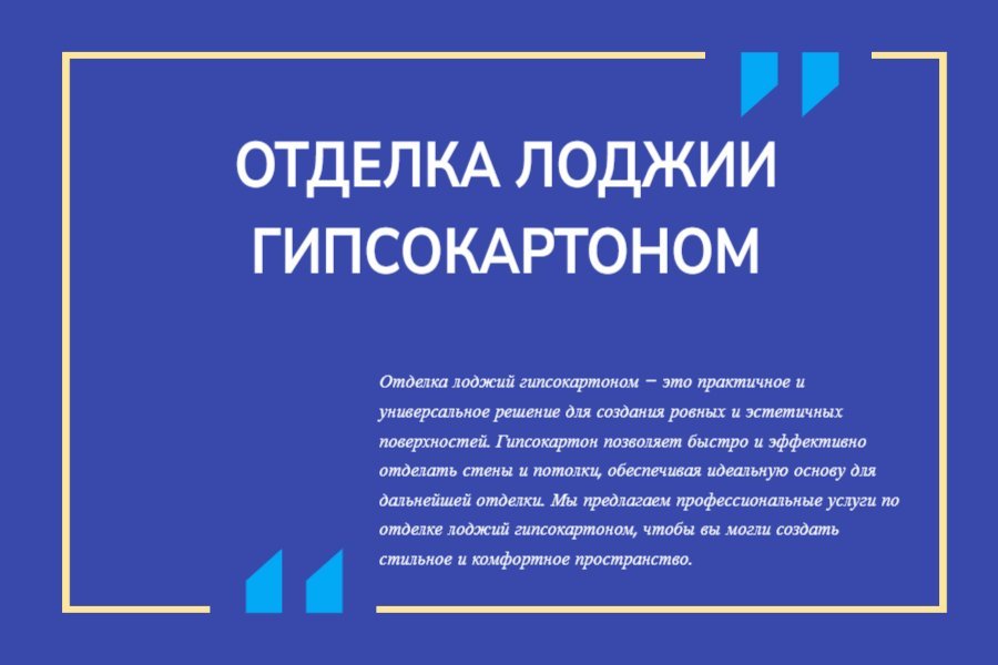 Отделка лоджий гипсокартоном – это практичное и универсальное решение для создания ровных и эстетичных поверхностей. Гипсокартон позволяет быстро и эффективно отделать стены и потолки, обеспечивая идеальную основу для дальнейшей отделки. Мы предлагаем профессиональные услуги по отделке лоджий гипсокартоном, чтобы вы могли создать стильное и комфортное пространство.